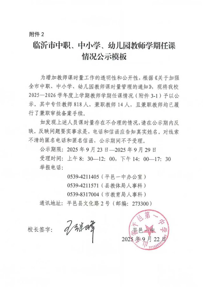 平邑一中关于2025-2026学年度上学期学期初任课情况安排表的公示